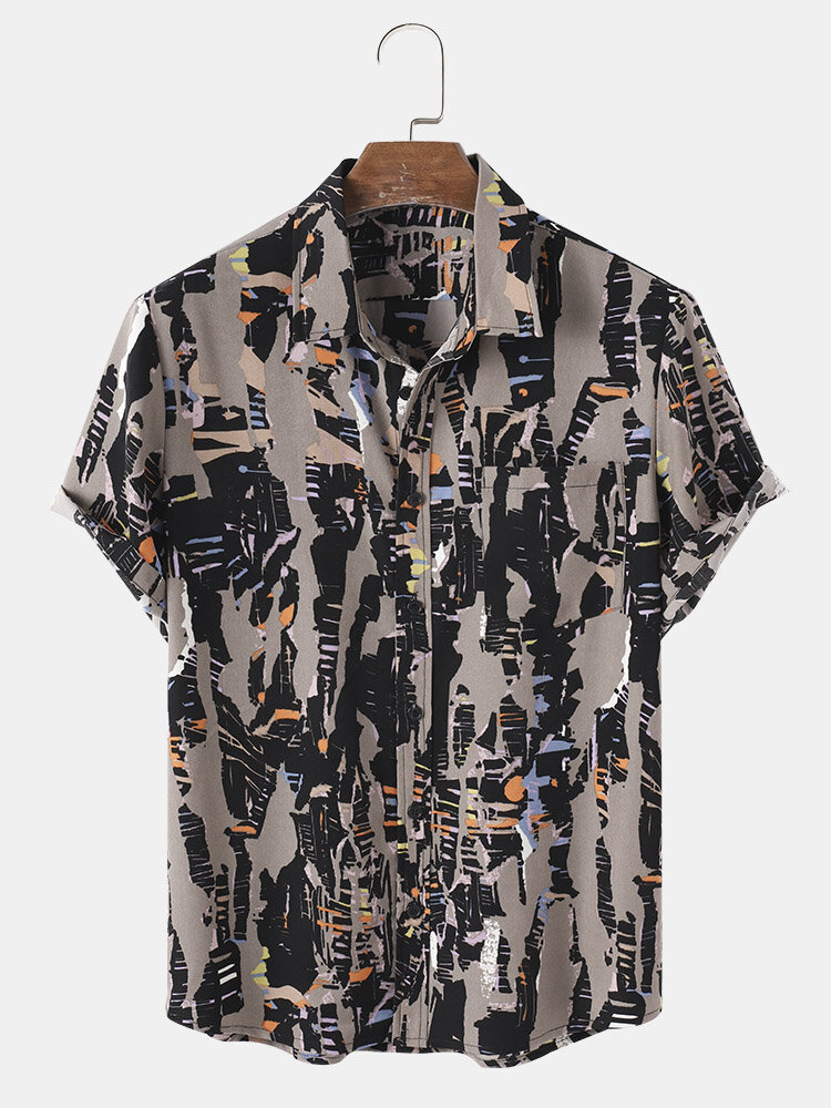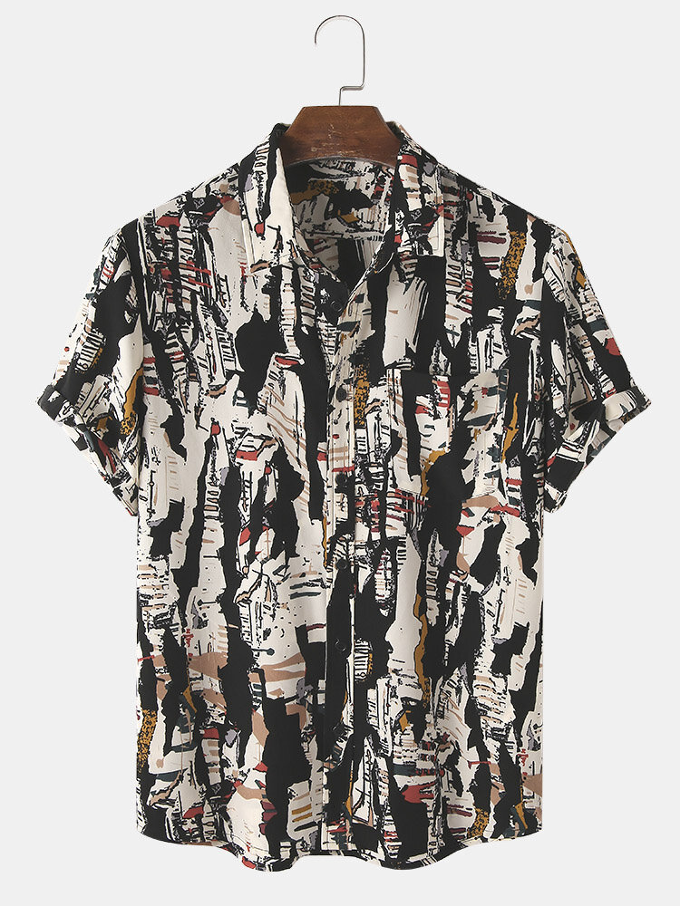 Mens Abstract Print Lapel Pocket Casual Short Sleeve Shirts – White S