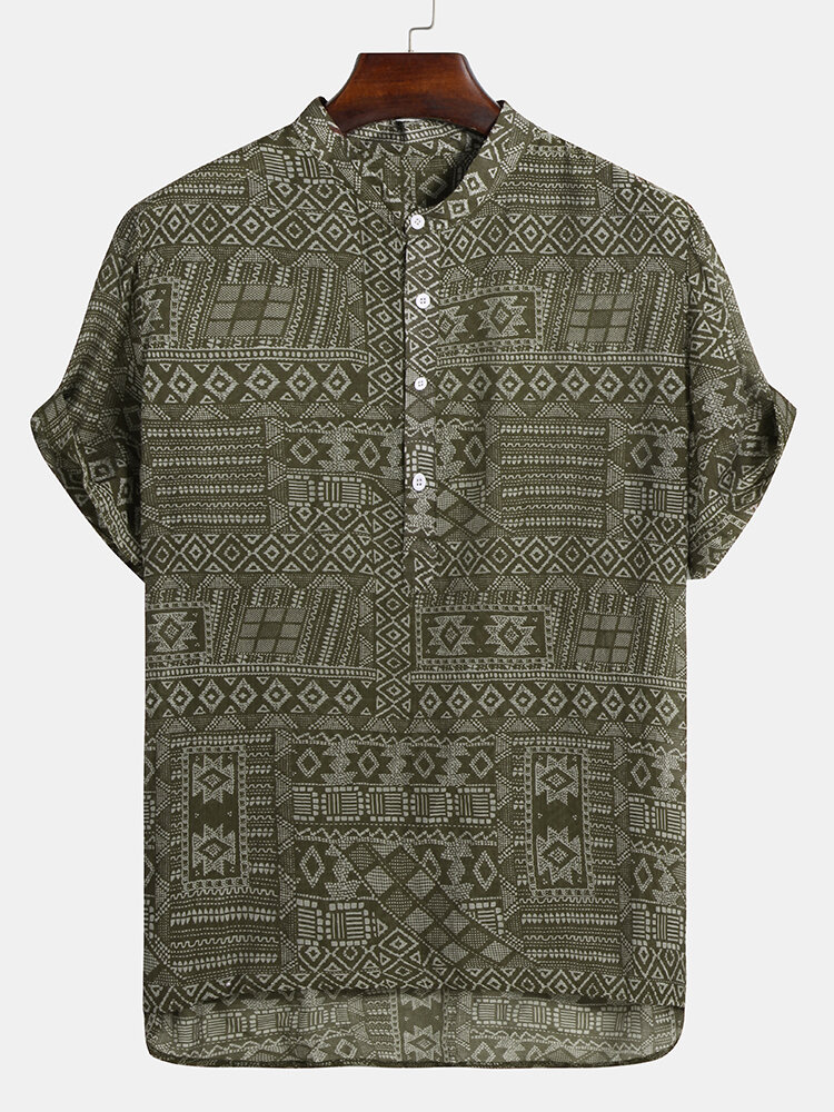 Decoration:ButtonFit Type:Regular FitNeckline:Henley CollarPattern Type:GeometricScene:Leisure,HomeSeason:Spring,SummerSize:XXXL,L,XL,MSleeve:Short SleeveStyle:VintageThickness:Regular