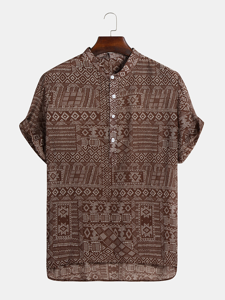 Mens Abstract Printing Ethnic Style Short Sleeve Loose Casual Henley Shirts – Brown 2XL