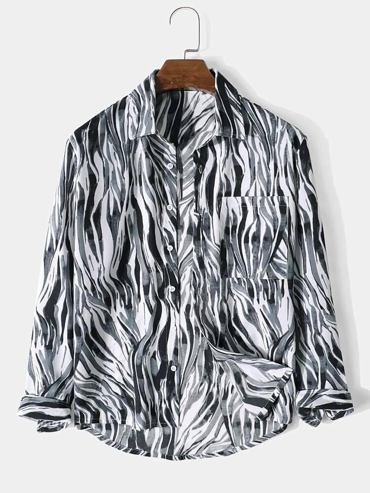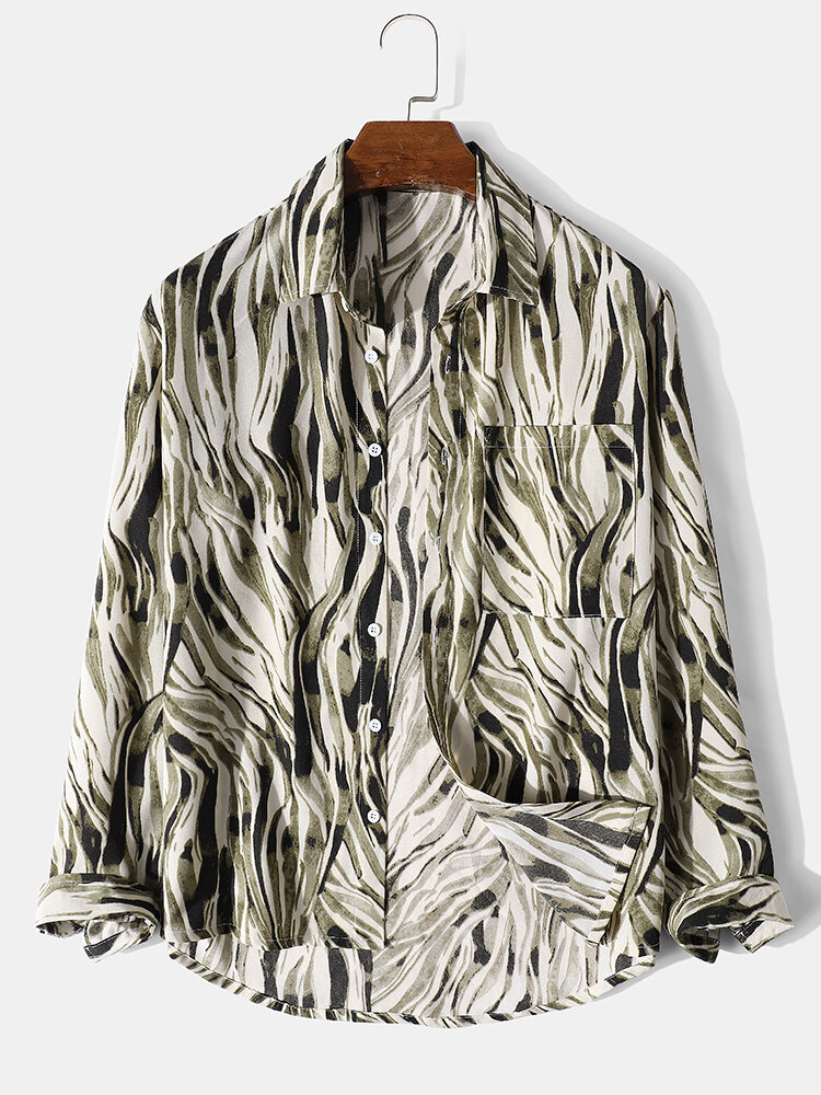 Mens Abstract Wave Print Button Up Holiday Long Sleeve Shirts With Pocket – Green S