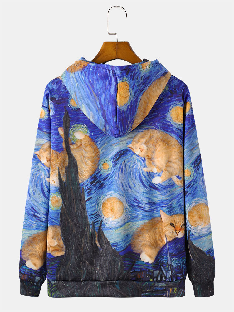 Mens All Over Cat Painting Print Drawstring Pullover Hoodies With Pouch Pocket – Blue M