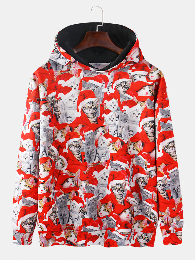 Mens All Over Cat Print Drop Shoulder Casual Kangaroo Pocket Hoodies – Red XL
