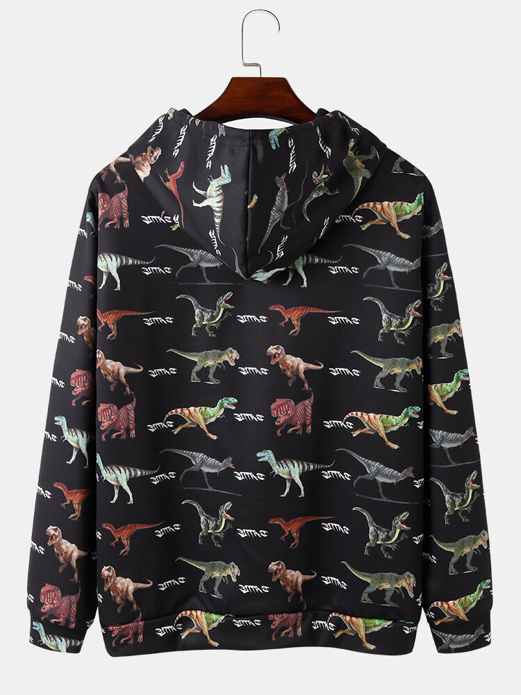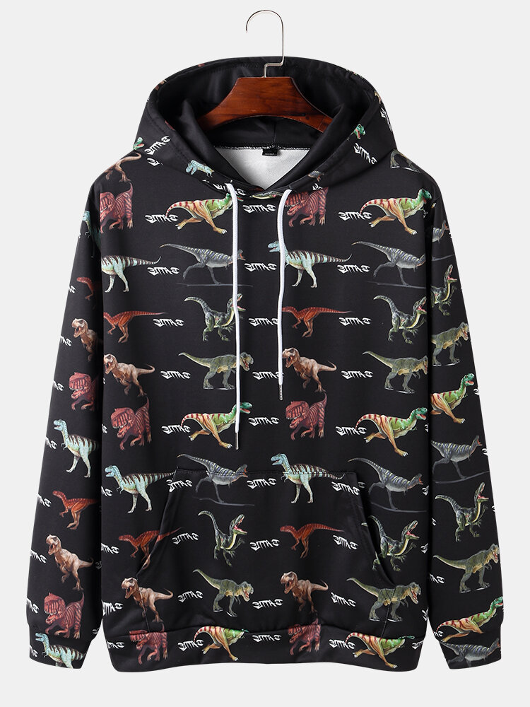 Mens All Over Dinosaur Print Drawstring Black Hoodies With Pouch Pocket – Black M
