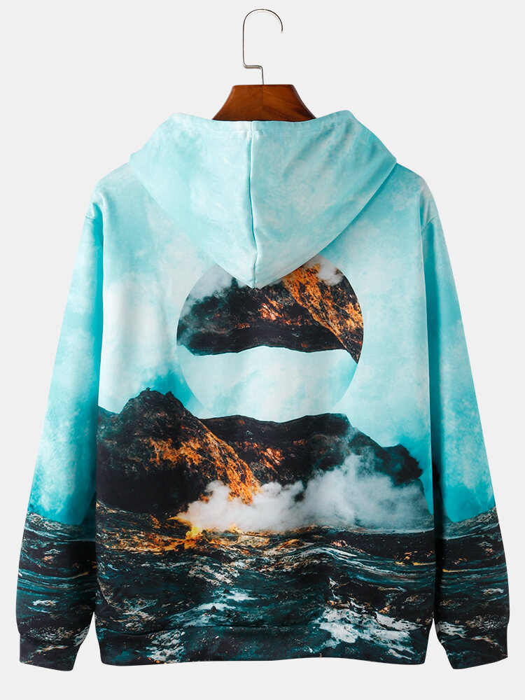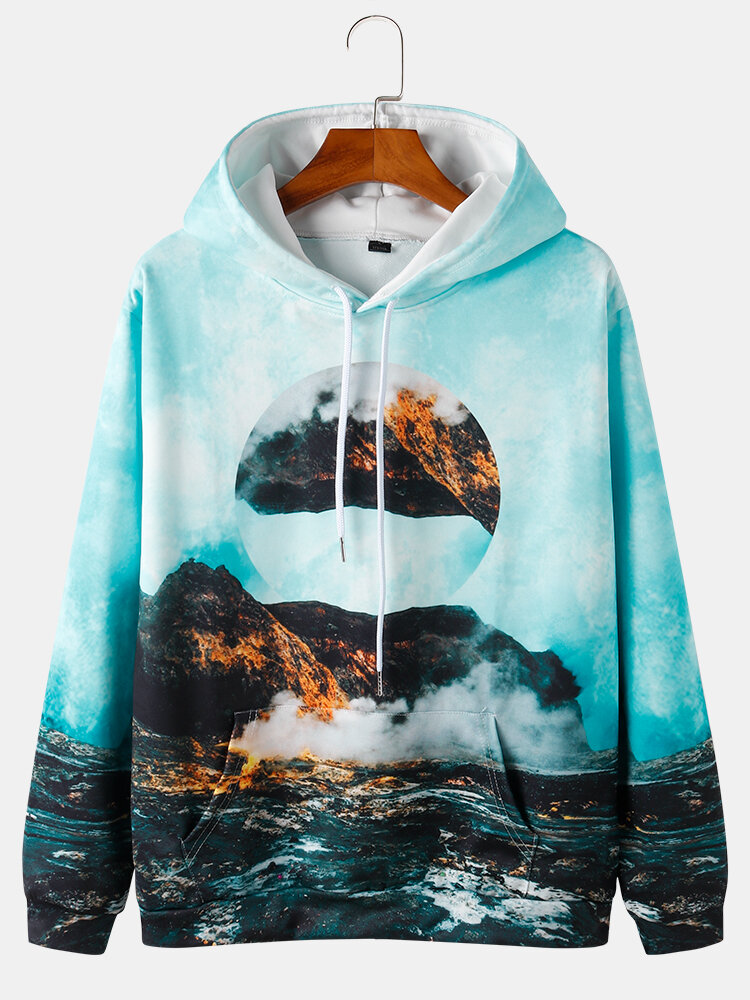 Mens All Over Mountain Scenery Print Drawstring Pullover Hoodies – Blue L
