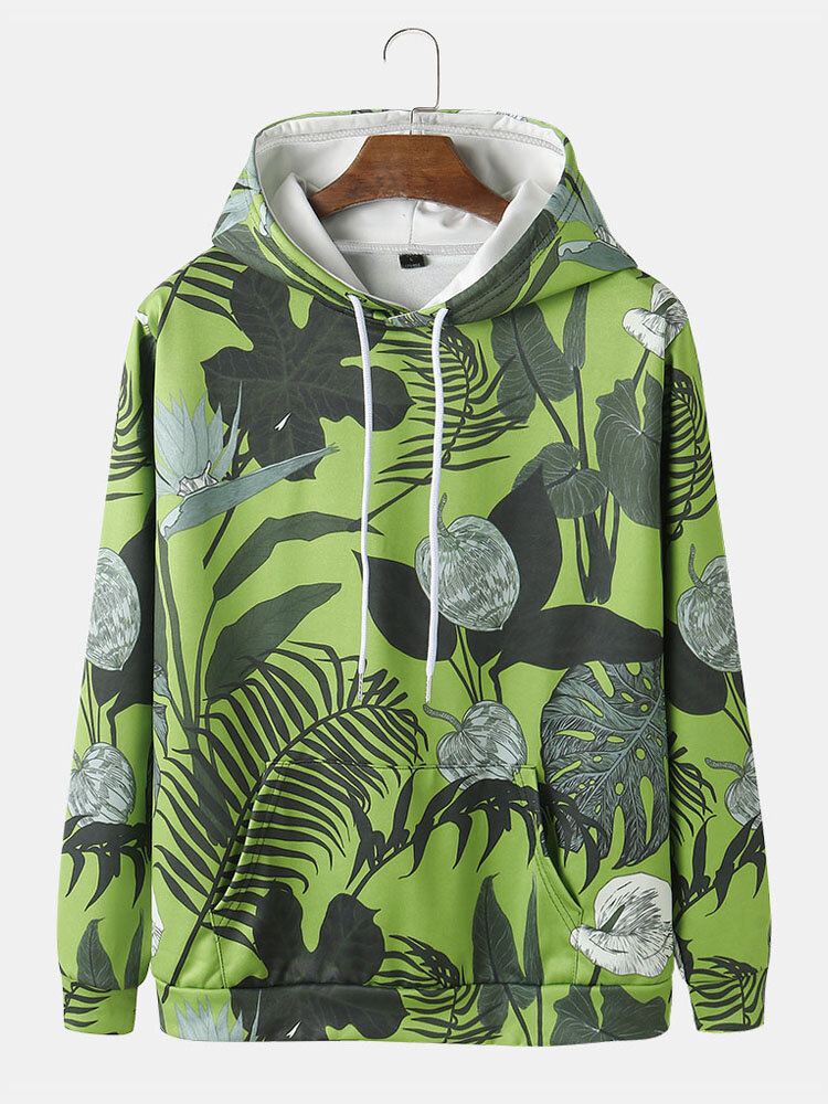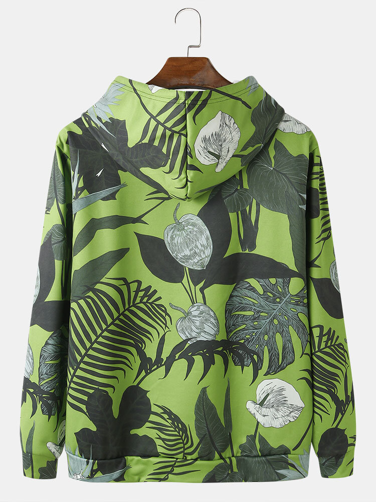 Mens All Over Tropical Plant Print Drawstring Hoodies With Kangaroo Pocket – Green S
