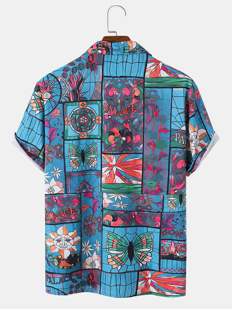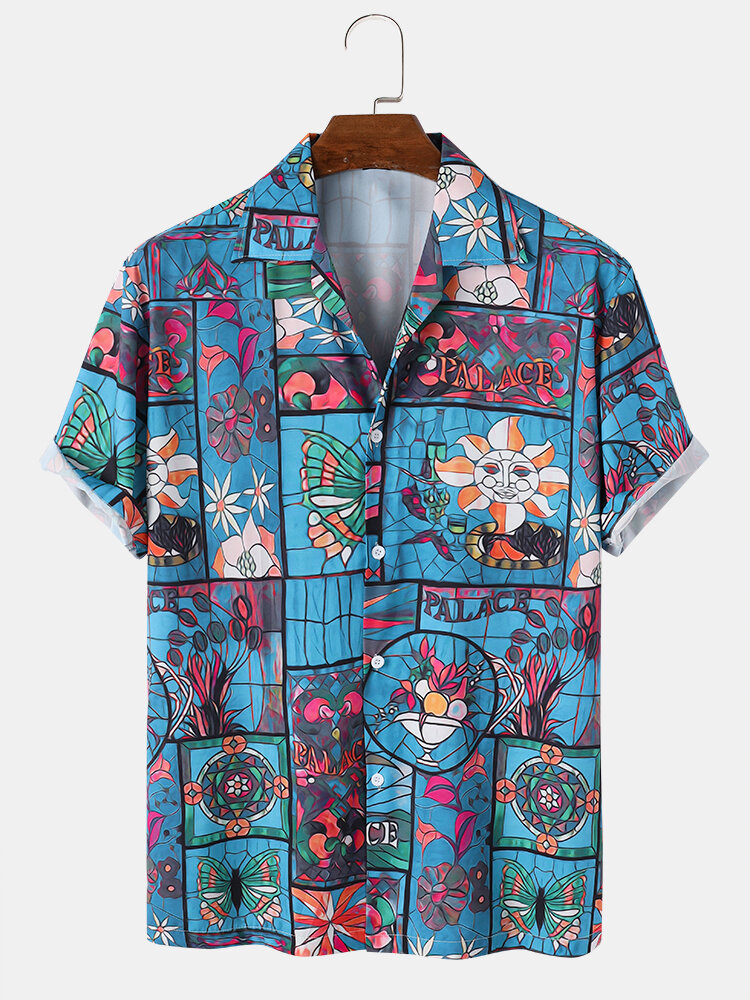 Mens All Over Vintage Flower Print Lapel Short Sleeve Shirts – Blue L