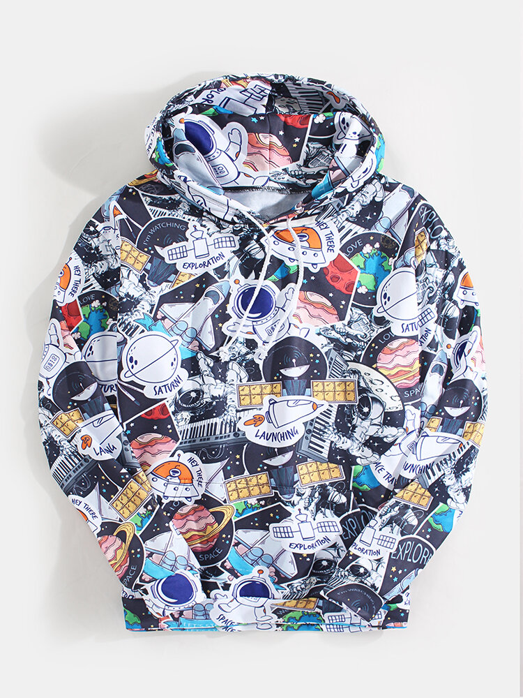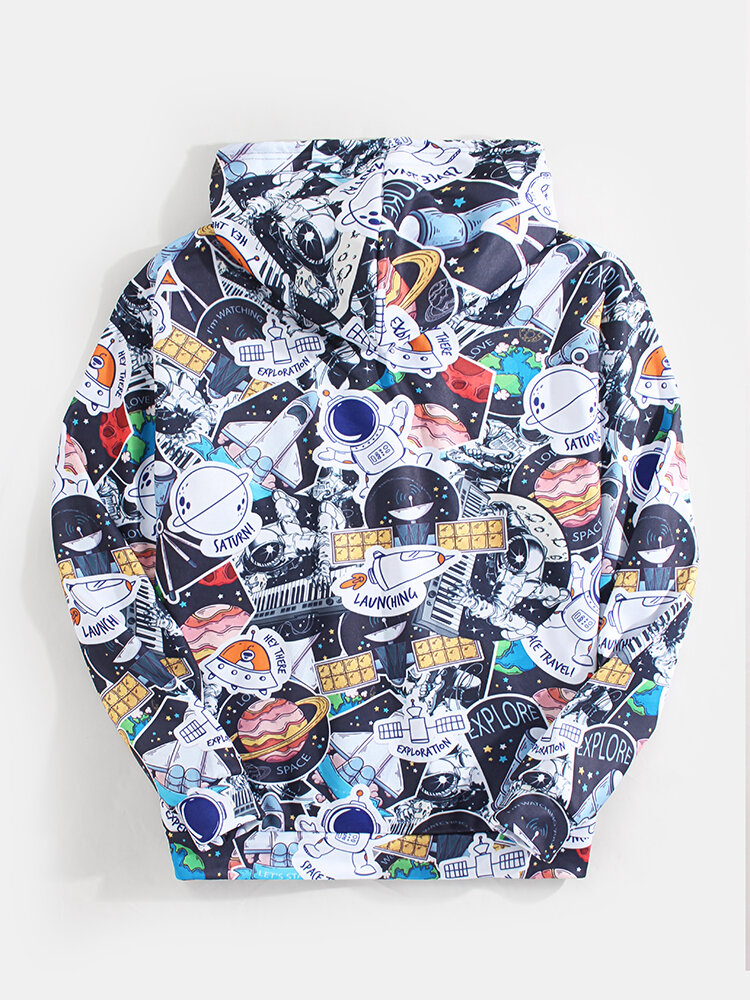 Mens Allover Cartoon Print Rocket Astronaut Print Kangaroo Pocket Long Sleeve Hoodies – Black 3XL