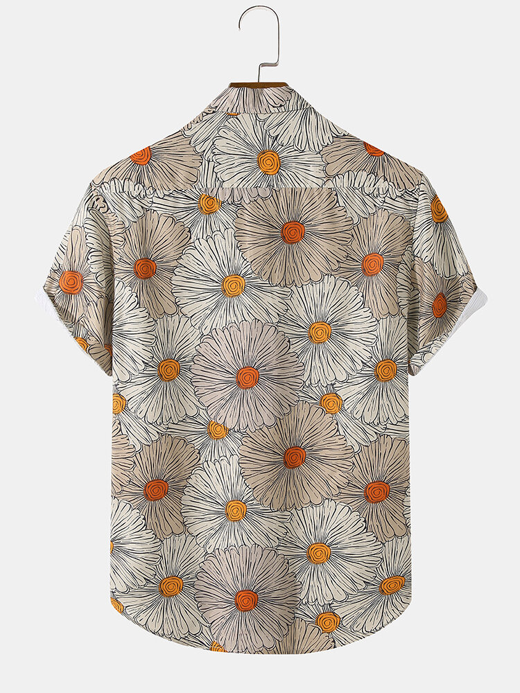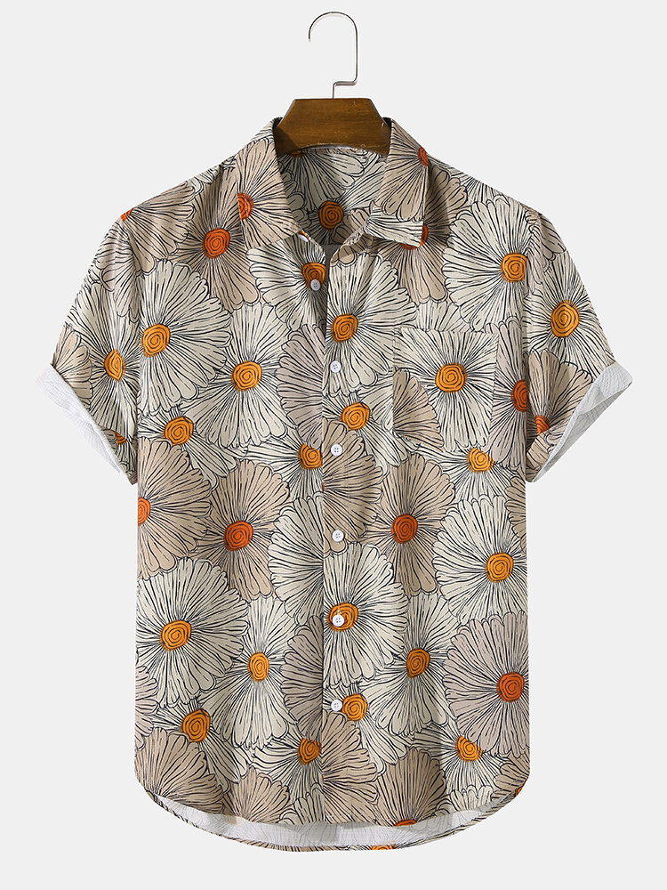 Mens Allover Floral Print Chest Pocket Holiday Short Sleeve Shirts – Beige L