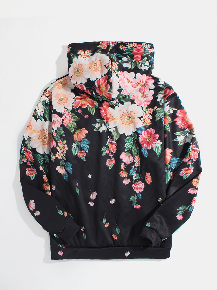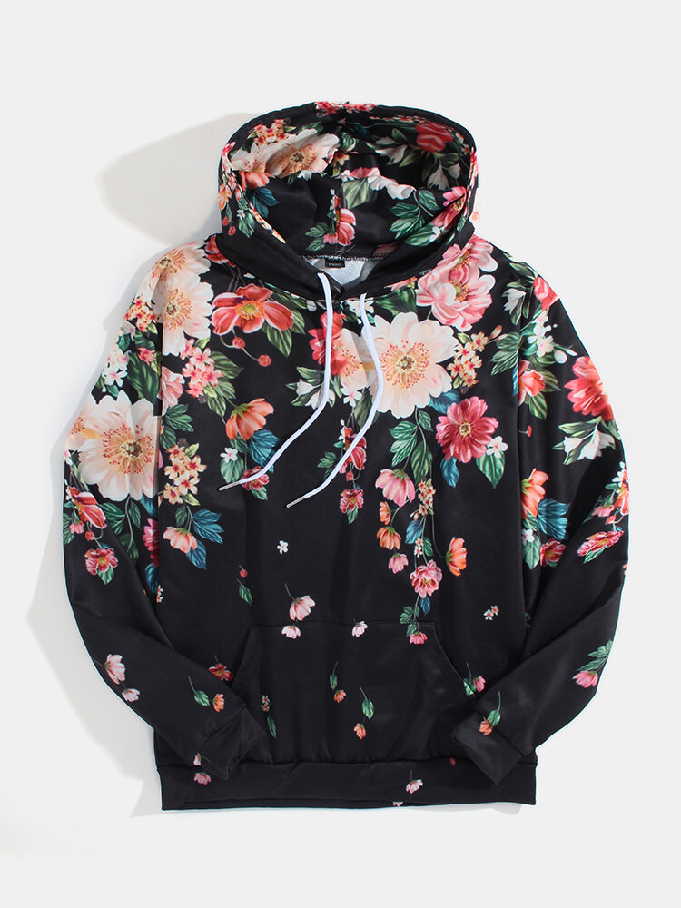 Mens Allover Floral Print Pouch Pocket Casual Drawstring Hoodies – Black M