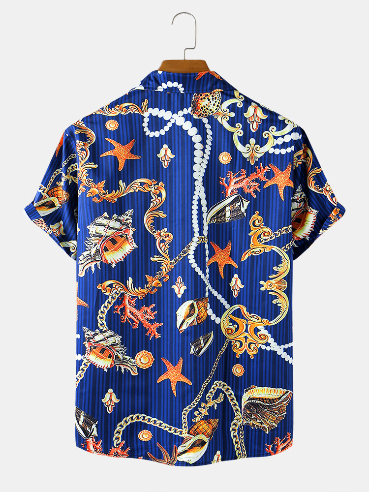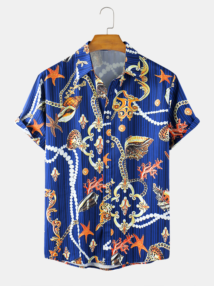 Mens Allover Starfish Print Casual Light Lapel Collar Short Sleeve Shirts – Blue XL