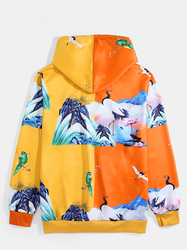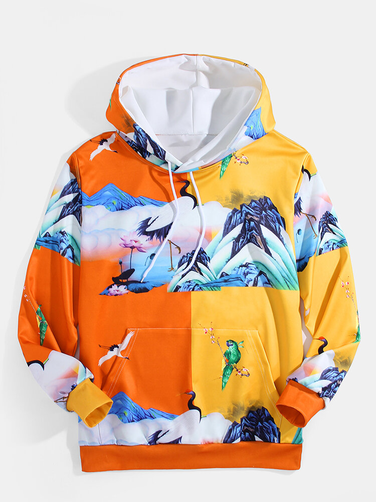 Mens Animal & Landscape Print Patchwork Drawstring Hoodies With Kangaroo Pocket – L Yellow