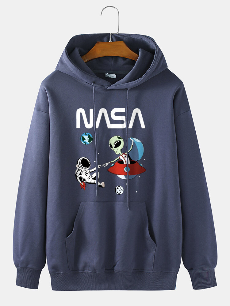 Mens Astronaut Alien Cartoon Print 100% Cotton Casual Loose Pullover Hoodie – White M
