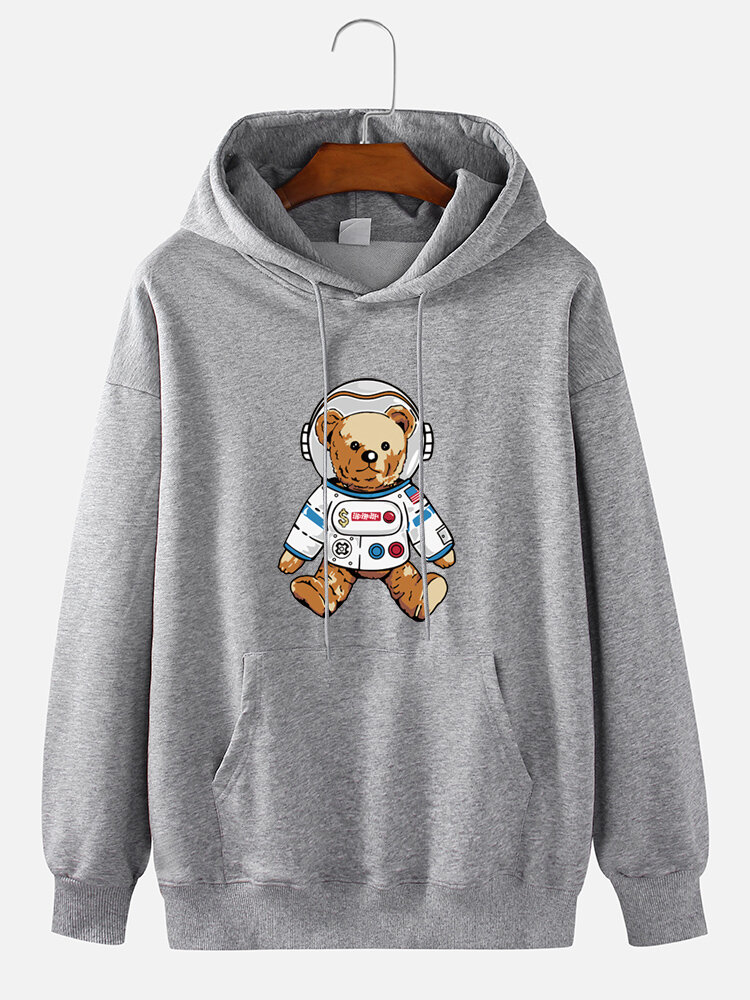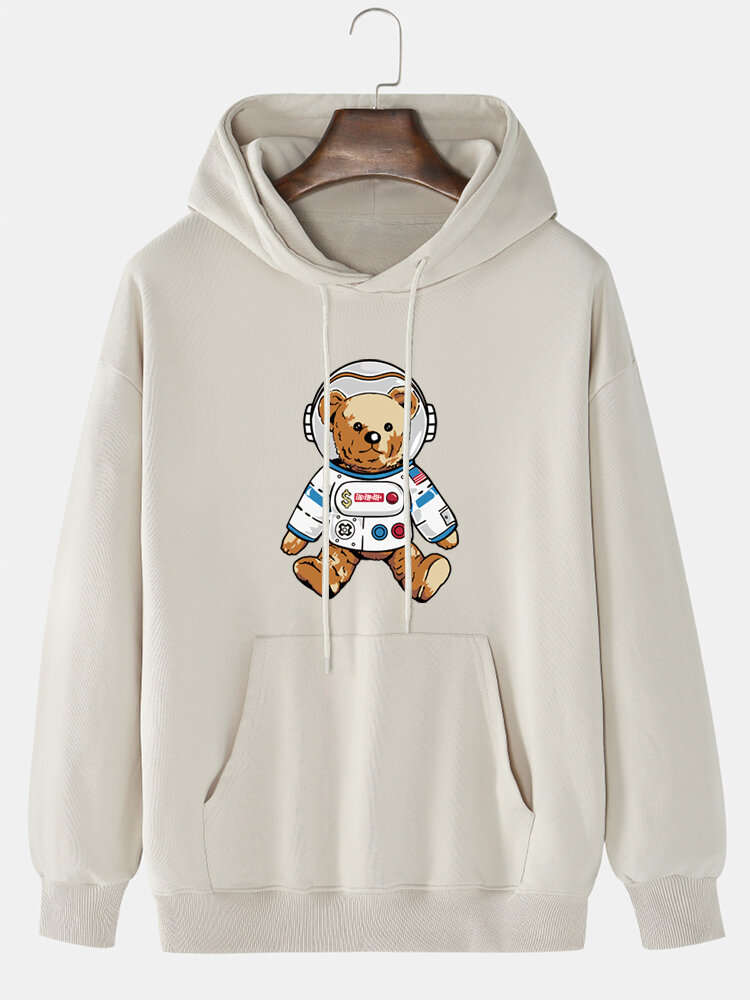 Mens Astronaut Bear Cartoon Print Plain Casual Cotton Pullover Hoodie – White S