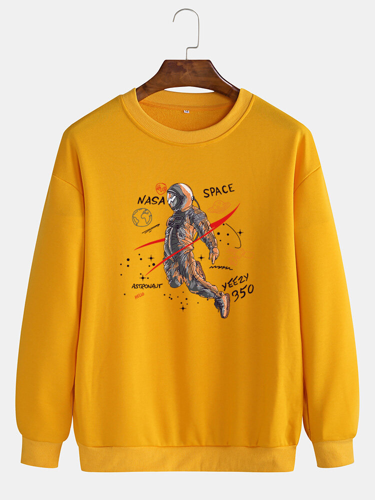 Mens Astronaut Print Pullover Drop Shoulder Long Sleeve Casual Sweatshirts – Yellow L