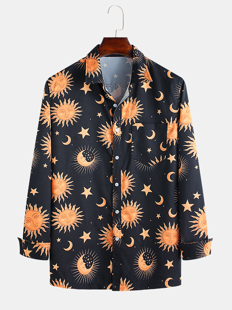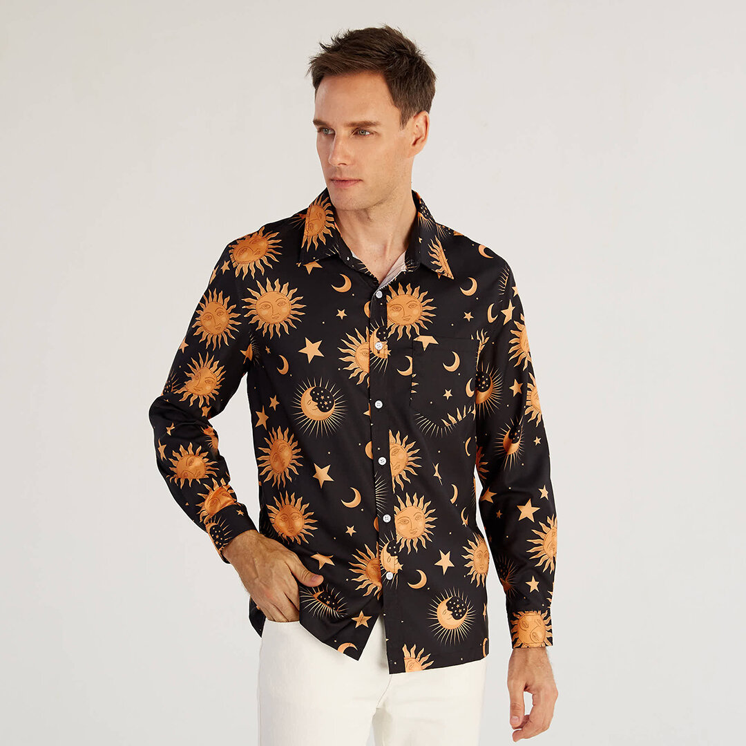 Mens Autumn Star Moon Printing Long Sleeve Casual Shirts – 2XL Black