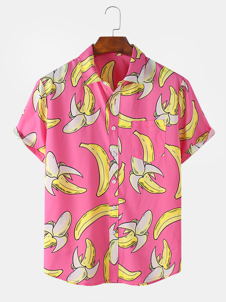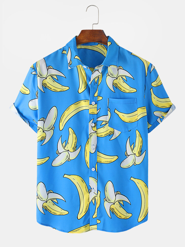 Mens Banana Print Turn Down Collar Short Sleeve Shirts – Blue 3XL