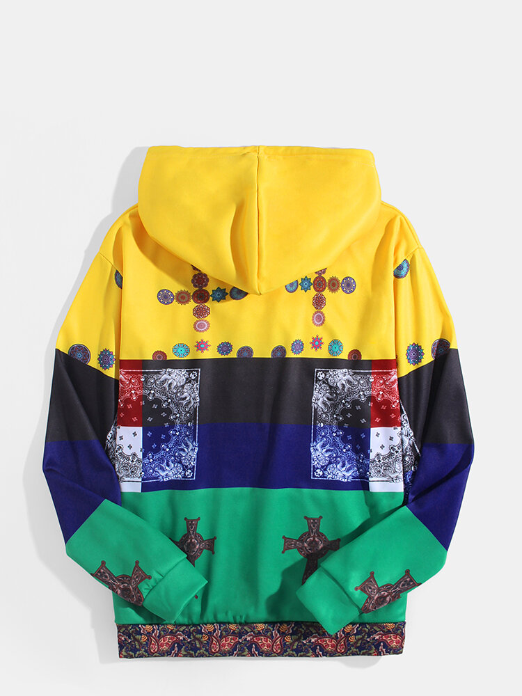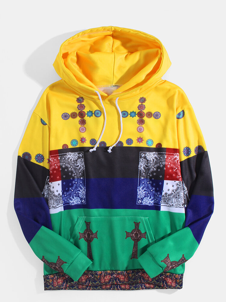 Mens Bandana Ethnic Style Print Color Block Long Sleeve Hoodies – L Yellow