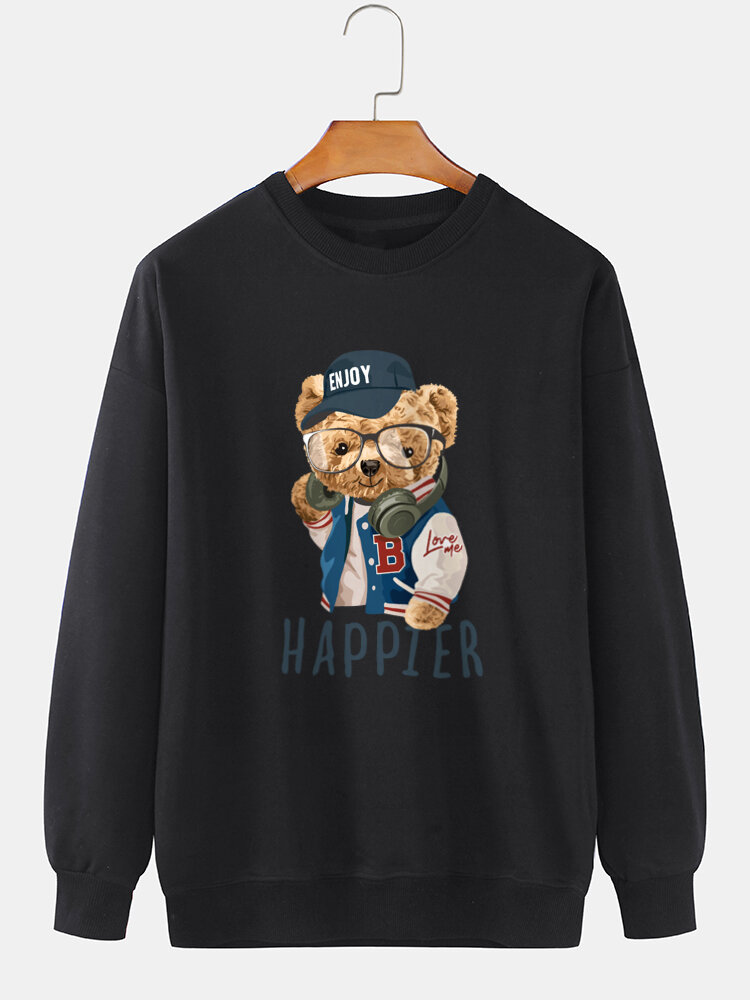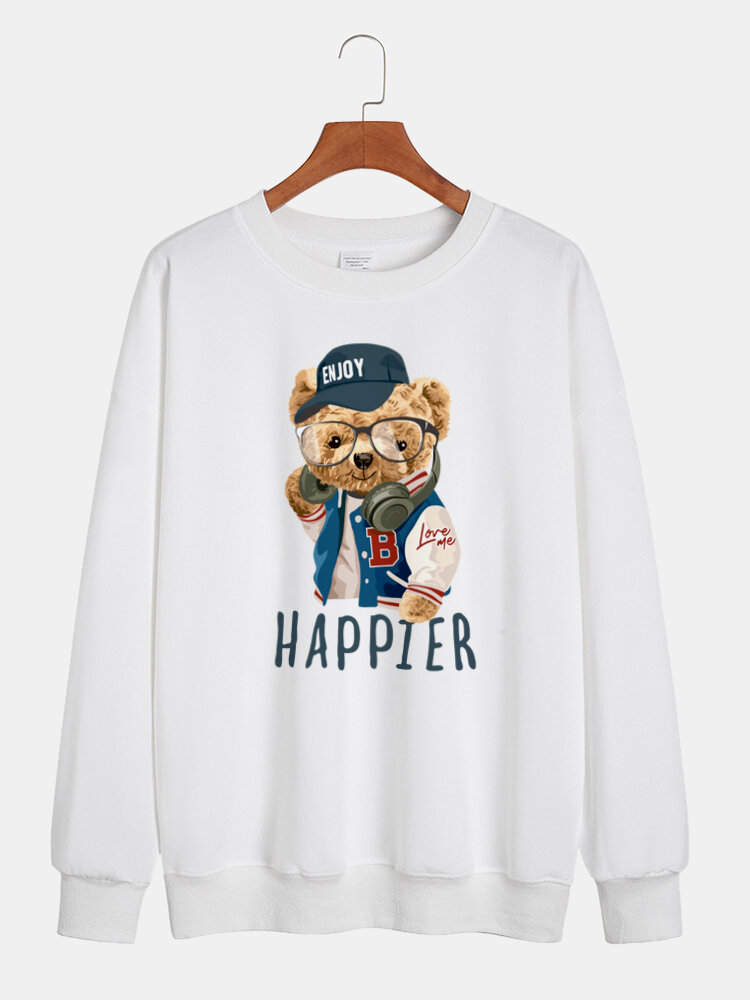 Mens Bear Cartoon Printed Preppy Crew Neck Sweatshirt – White S