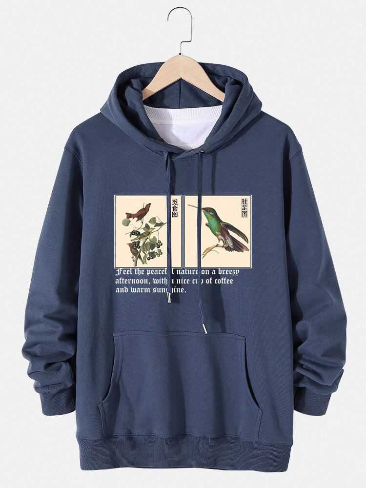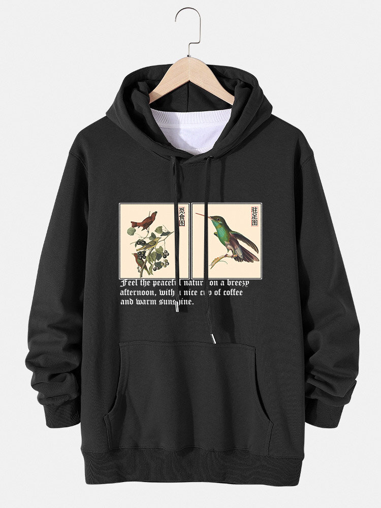 Mens Bird Chinese Painting Text Print Cotton Drawstring Hoodies – Black S