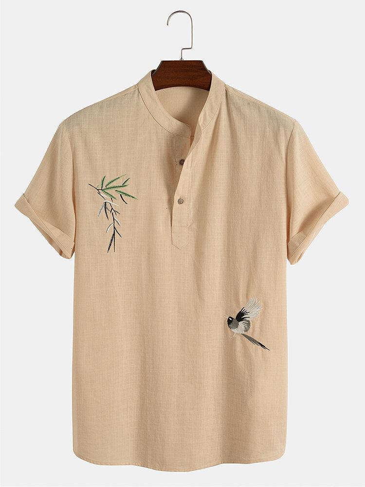 Mens Bird Tree Embroidery 100% Cotton Causal Shirts – Khaki S