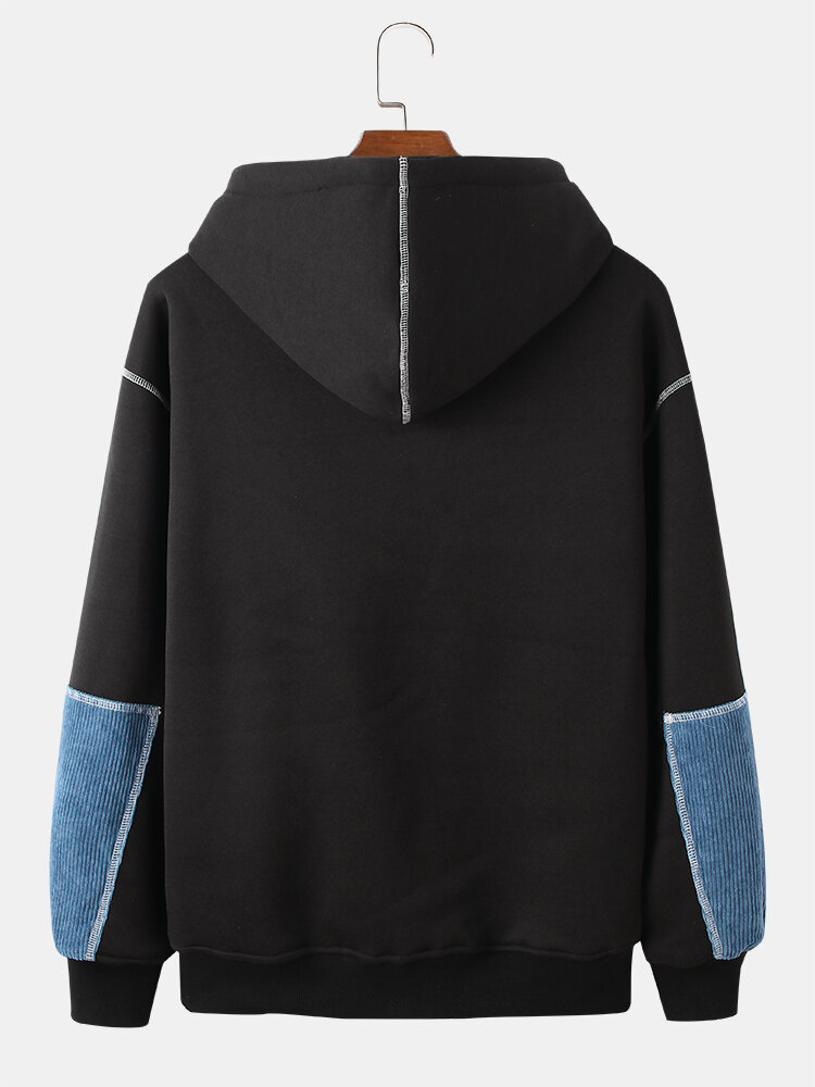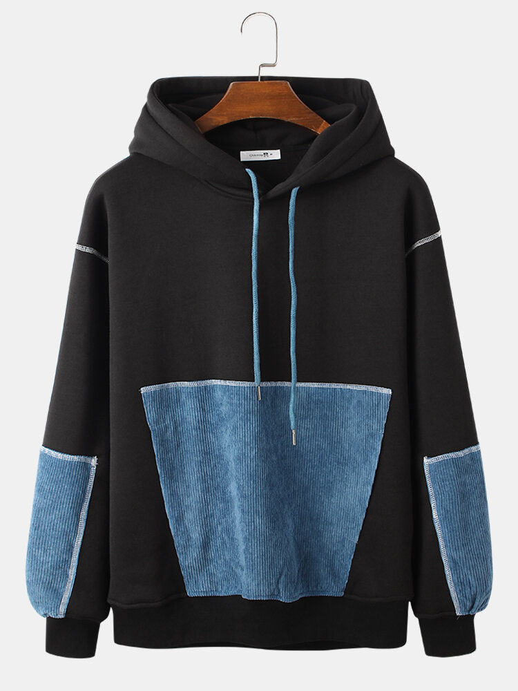 Mens Black Patchwork Corduroy Long Sleeve Casual Hoodies With Pocket – Black S