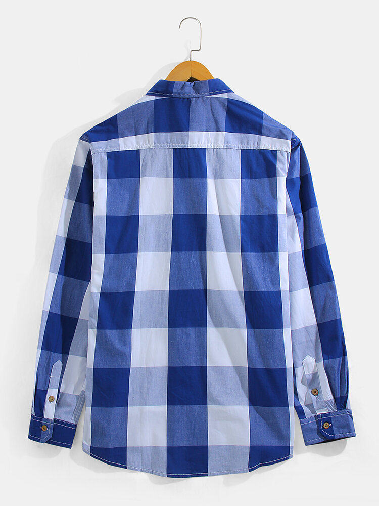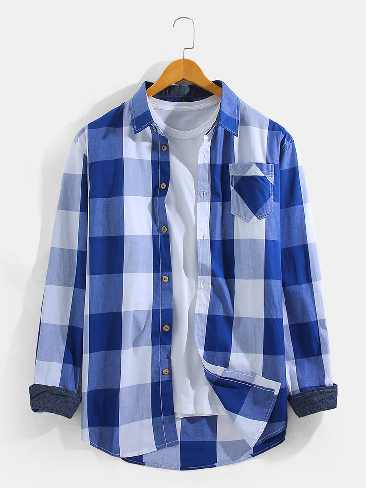Mens Blue Plaid Print Lapel Button Up Long Sleeve Shirts With Chest Pocket – Blue 2XL