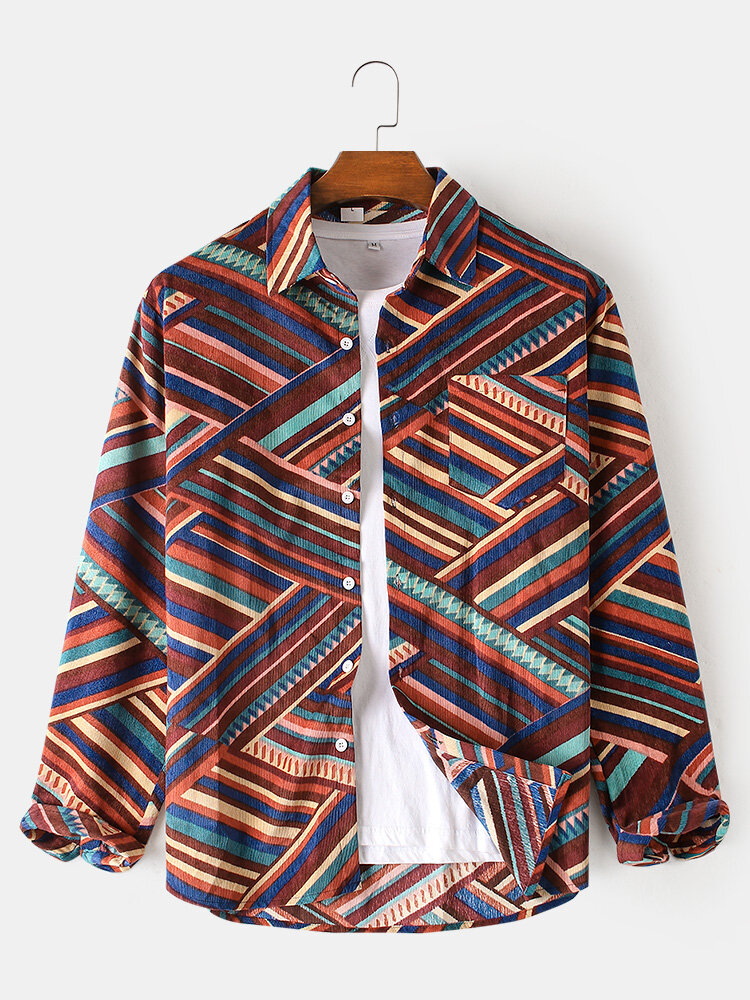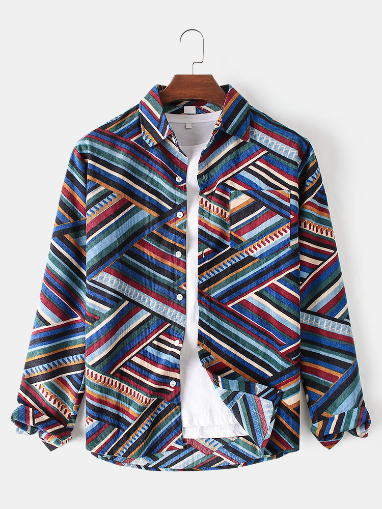 Mens Bohemia Geometric Stripe Print Corduroy Lapel Collar Long Sleeve Shirts – Blue 2XL