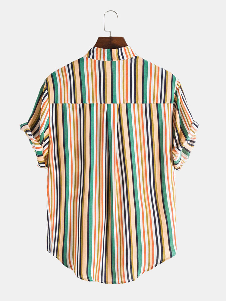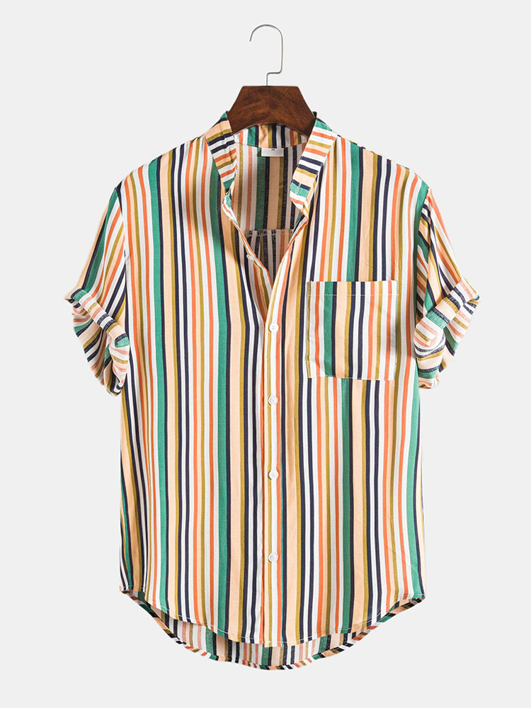 Decoration:Pocket,ButtonFit Type:Regular FitMaterial:CottonNeckline:Stand CollarPattern Type:StripedScene:Leisure,Home,CasualSeason:SummerSize:XXXL,XXL,L,S,XL,XXXXL,MSleeve:Short SleeveStyle:Casual