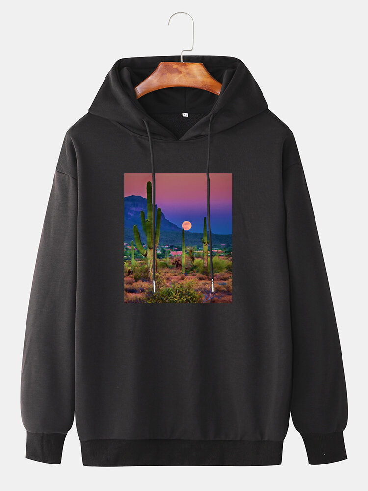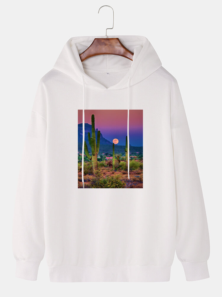 Mens Cactus Landscape Graphic Drop Shoulder Drawstring Hoodies – White M