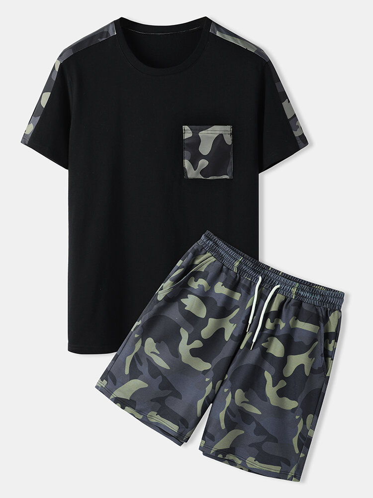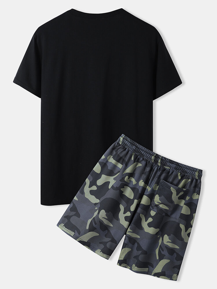 Mens Camo Print Sets Short Sleeve Drawstring Shorts Casual Two Pieces – Black XS
