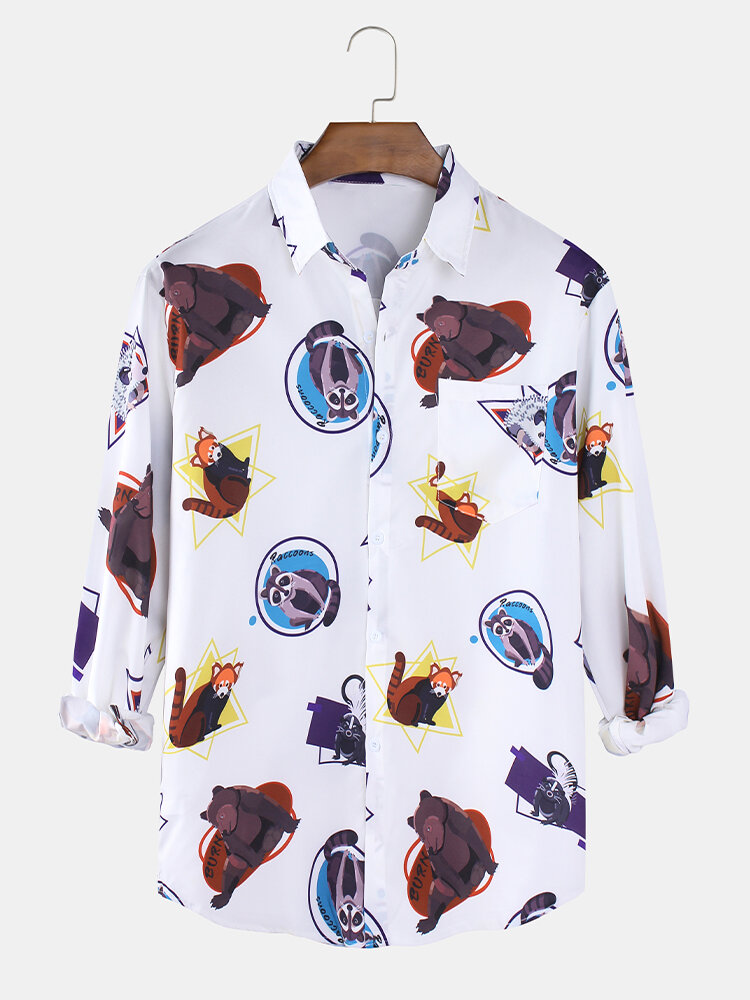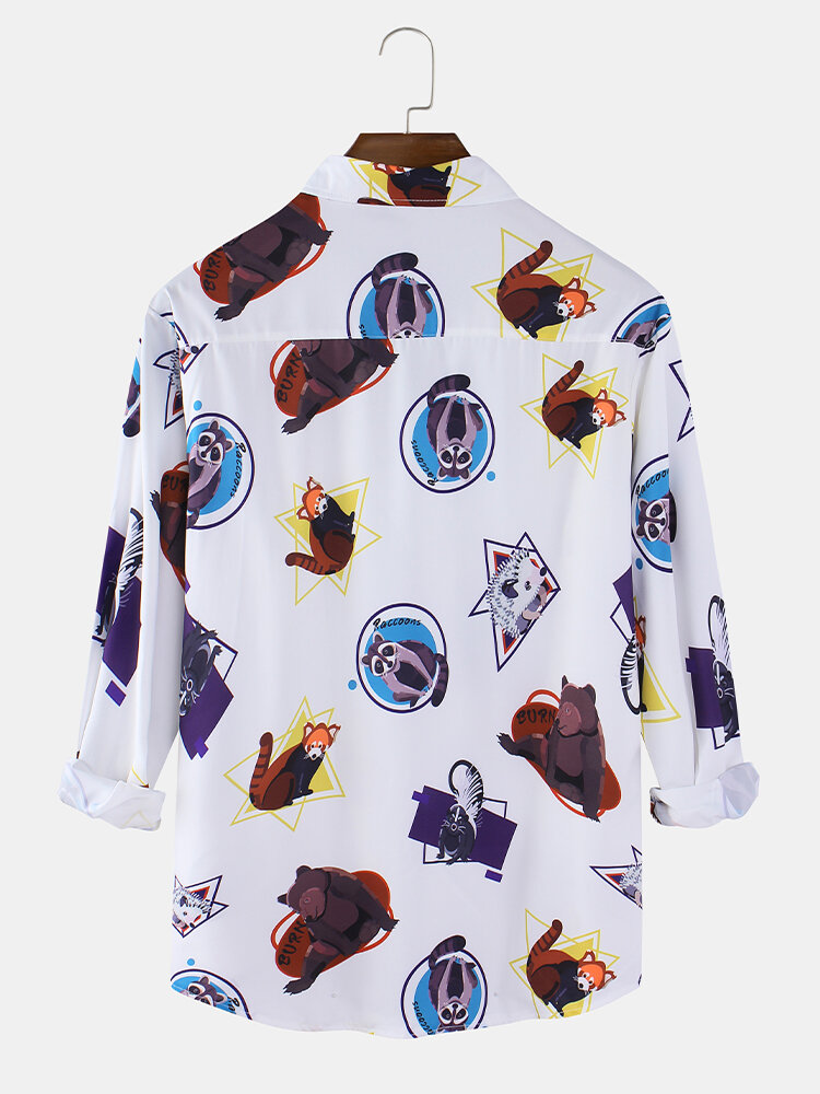 Mens Cartoon Animal Pattern Print Curved Hem Long Sleeve Shirts With Pocket – Dark Grey L
