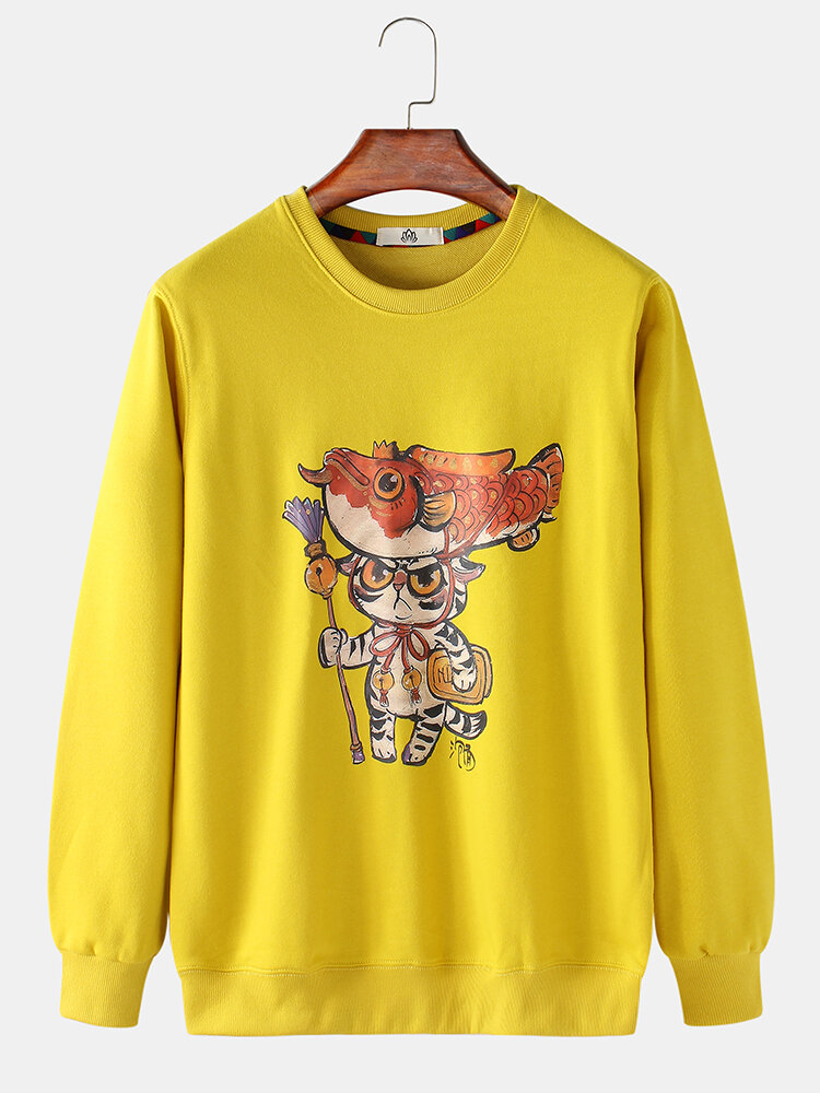 Mens Cartoon Animal Print Round Neck Pullover Long Sleeve Cute Sweatshirts – Grey S