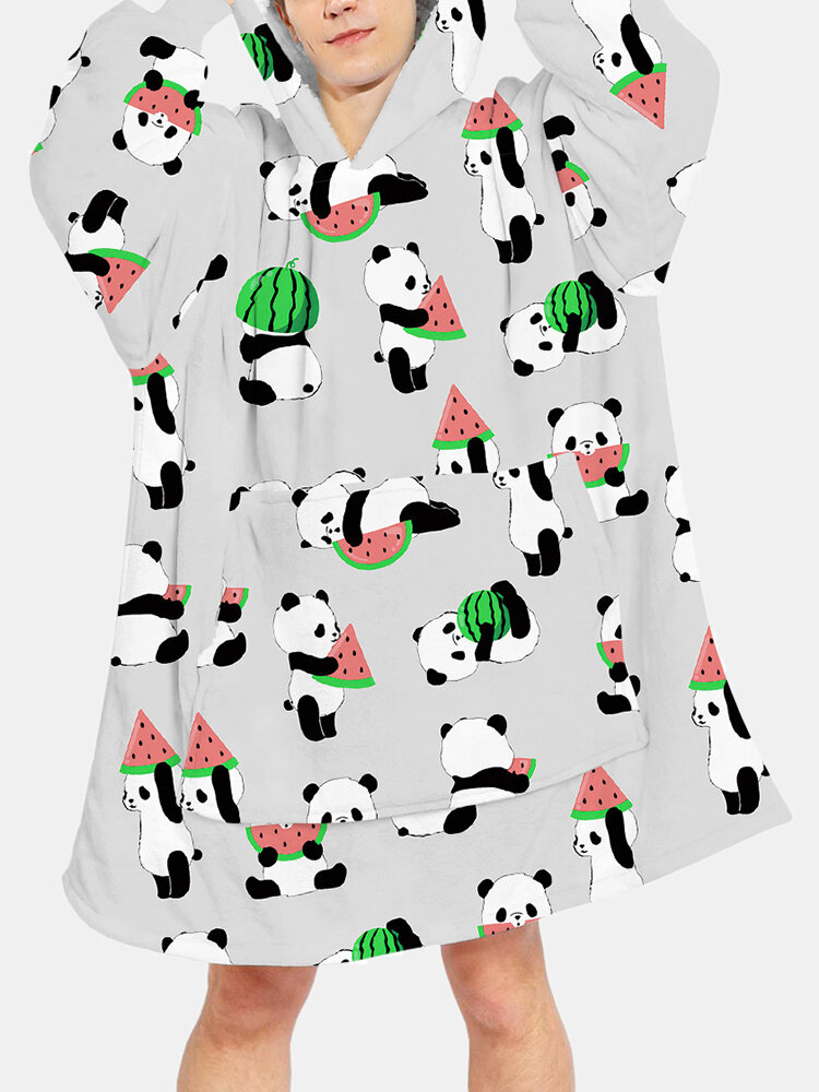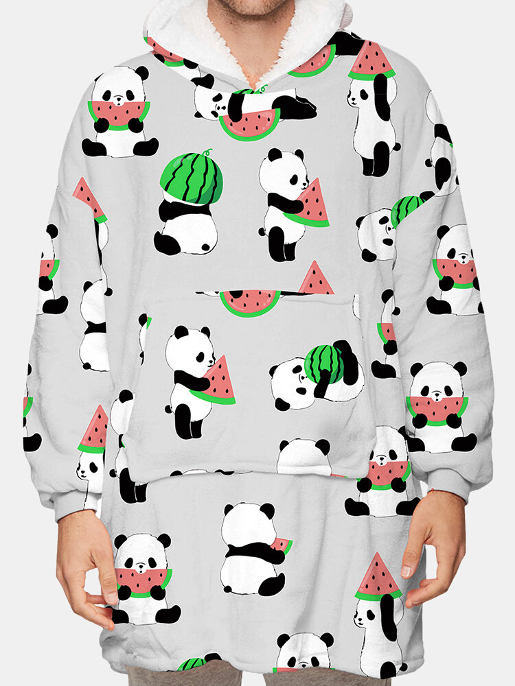 Mens Cartoon Animal Print Sherpa Lined Reversible Blanket Hoodie Warm Loungewear With Pocket – Grey One Size