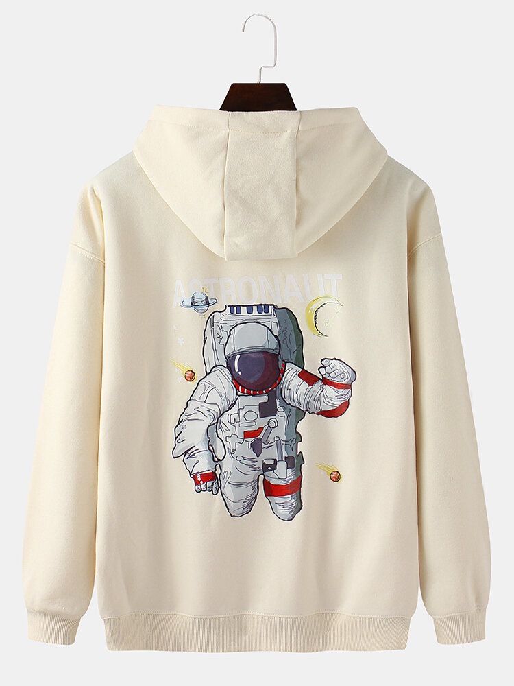 Mens Cartoon Astronaut Back Print Drop Shoulder Kangaroo Pocket Hoodies – Black M