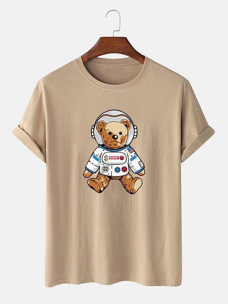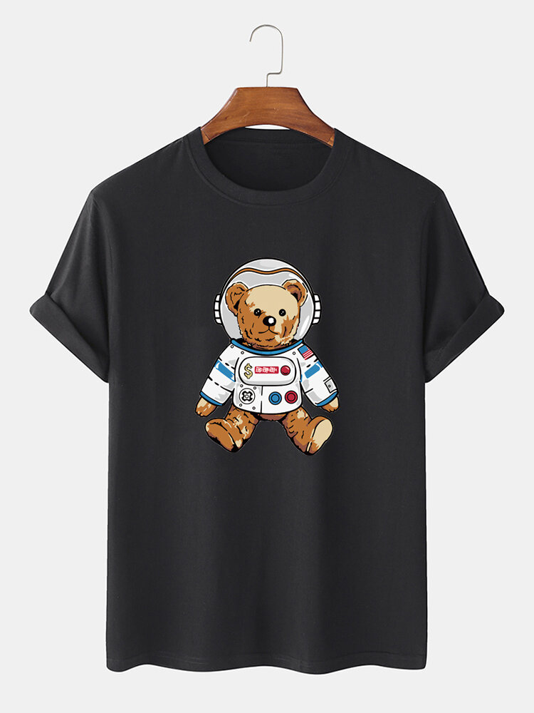 Mens Cartoon Astronaut Bear Print O-Neck Short Sleeve Casual T-Shirt – Black M