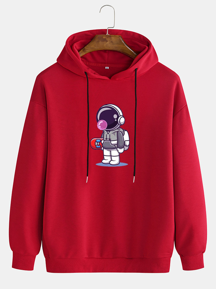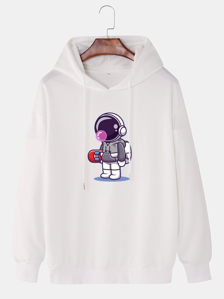 Mens Cartoon Astronaut Print Long Sleeve Drop Shoulder Hoodies – White L