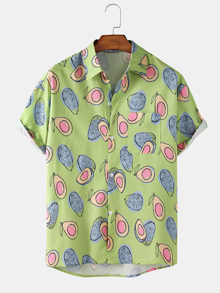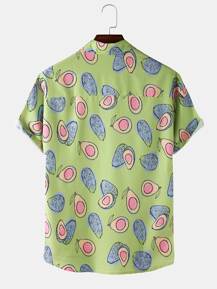 Mens Cartoon Avocado Print Turn Down Collar Short Sleeve Shirts – White L