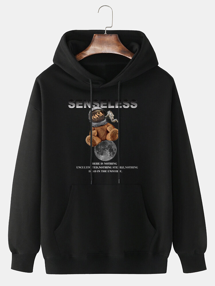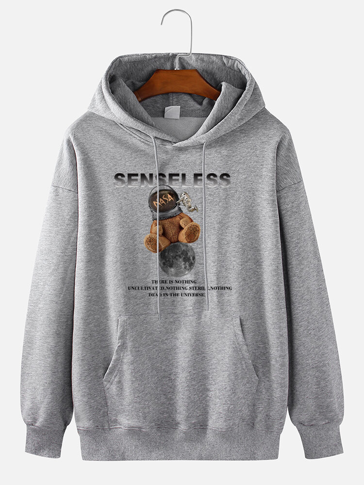 Mens Cartoon Bear Astronaut Print 100% Cotton Casual Drawstring Hoodies – Grey L