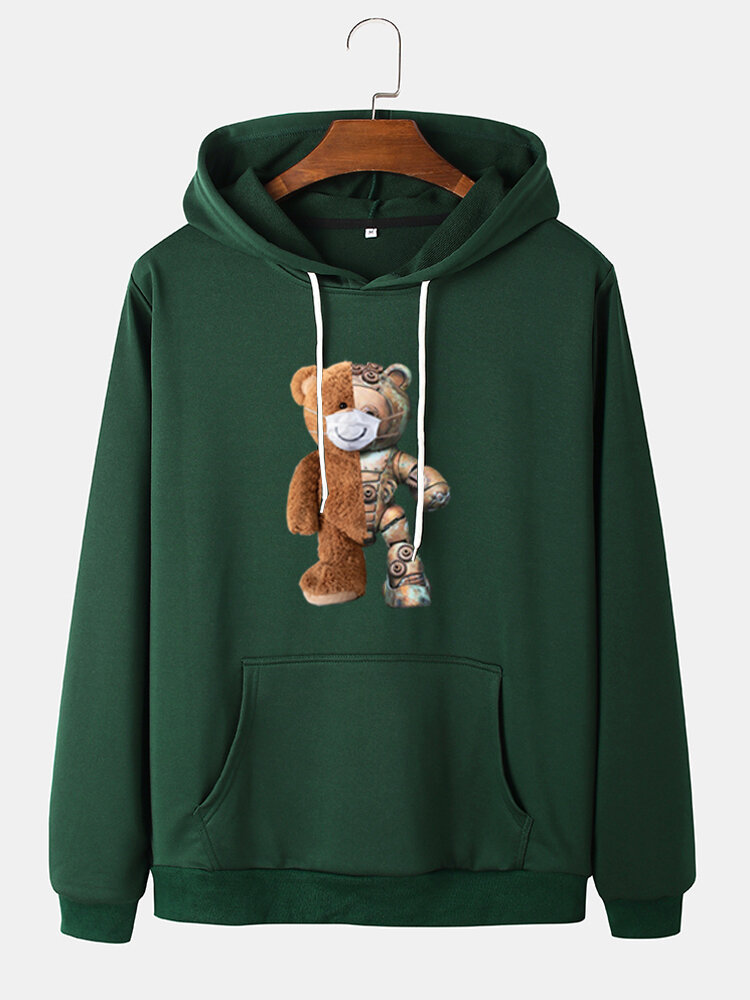 Mens Cartoon Bear Graphic Cotton Drawstring Hoodies With Pouch Pocket – Black L