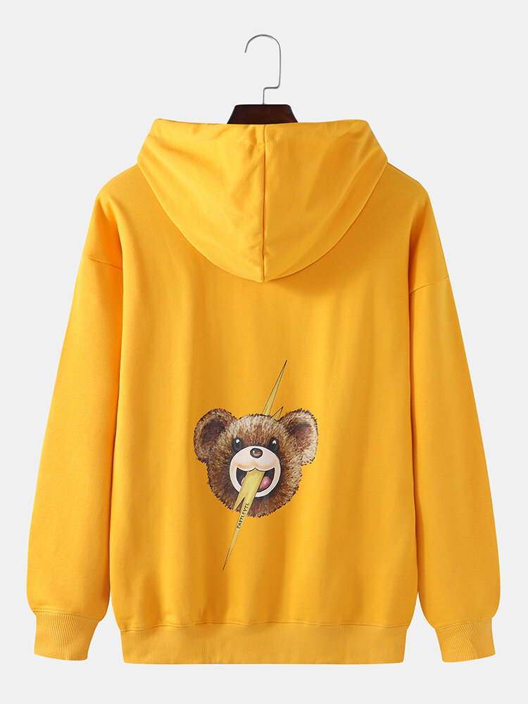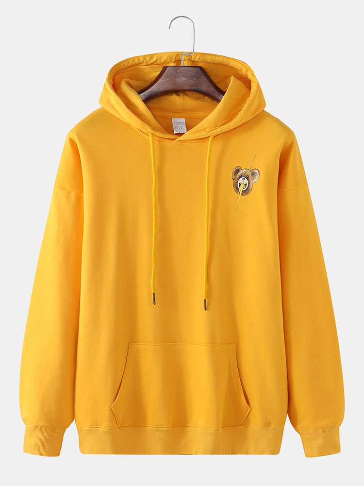 Mens Cartoon Bear Print Drop Shoulder Kangaroo Pocket Cute Hoodies – Orange L