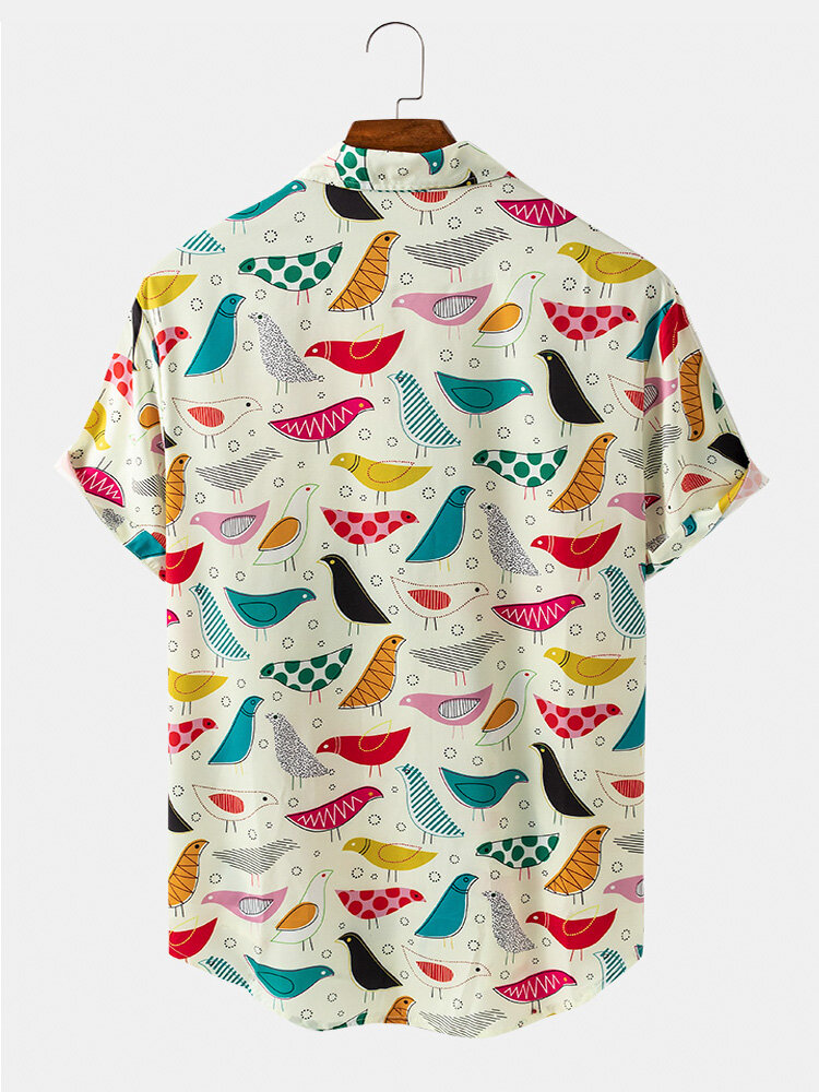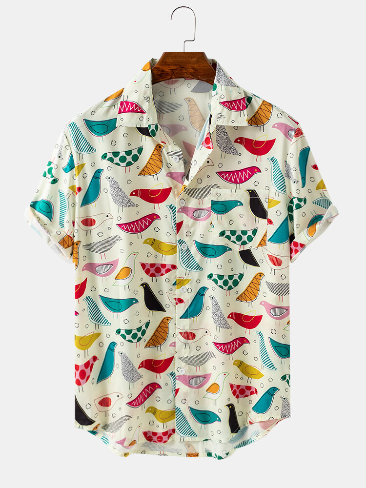 Mens Cartoon Bird Print Turn Down Collar Short Sleeve Shirts – Yellow 2XL