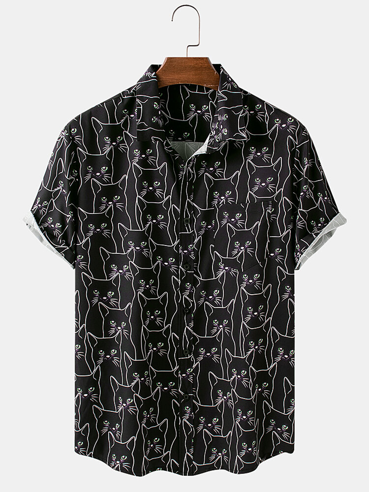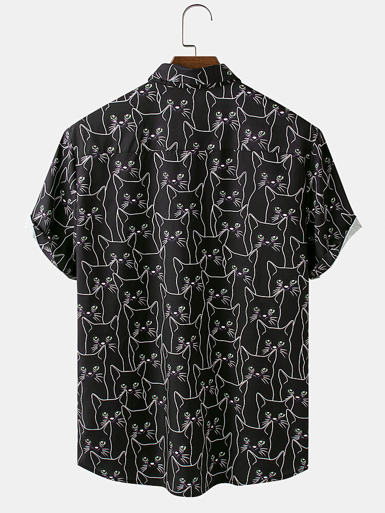 Mens Cartoon Black Cat Print Light Casual Short Sleeve Shirts – Black M