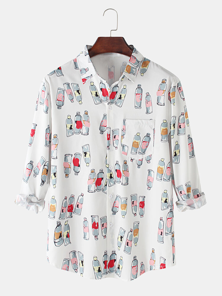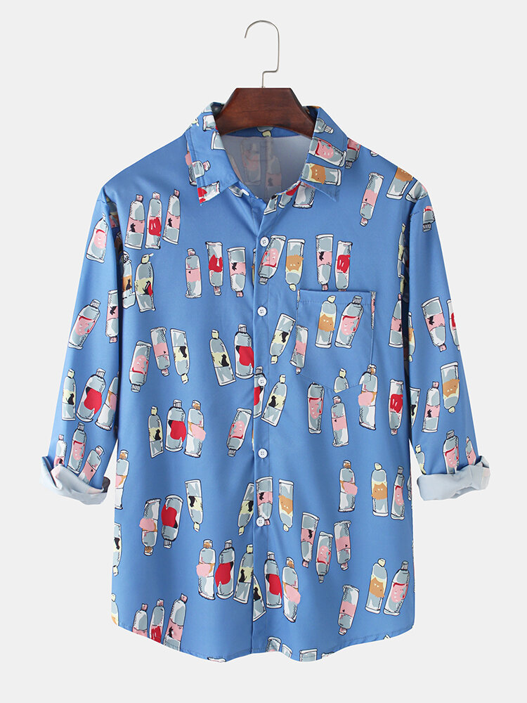 Mens Cartoon Bottle Print Chest Pocket Long Sleeve Casual Shirts – Blue XL