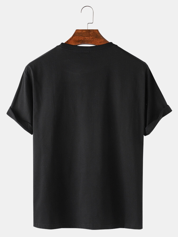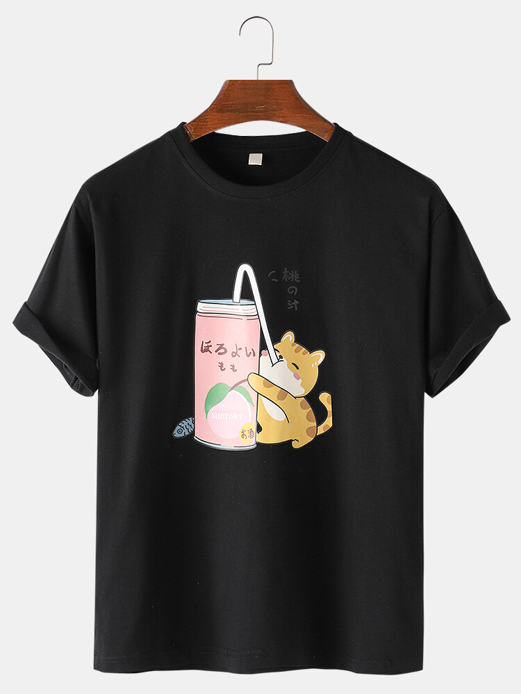 Mens Cartoon Cat Print Cotton Loose Light Casual Round Neck T-Shirts – White M