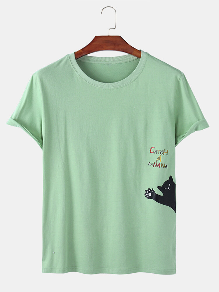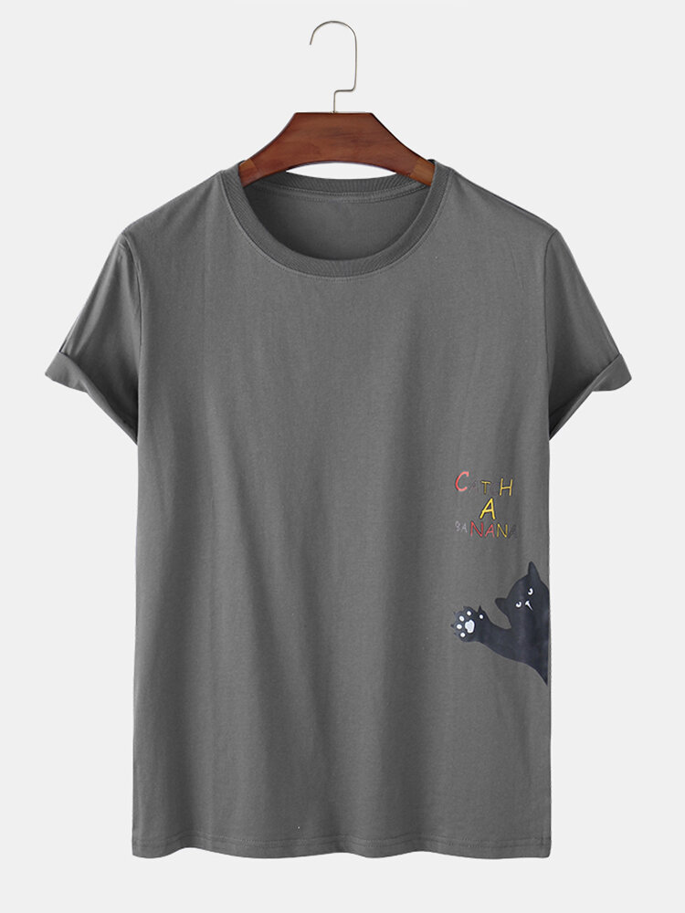 Mens Cartoon Cat Print Solid Color Summer Loose Breathable T-Shirts – White M