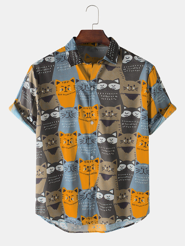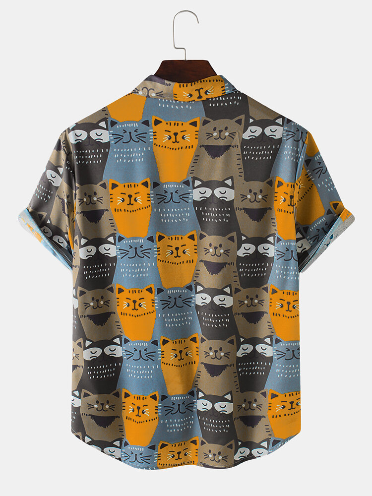 Mens Cartoon Cat Print Turn Down Collar Short Sleeve Shirts – Coffee L
