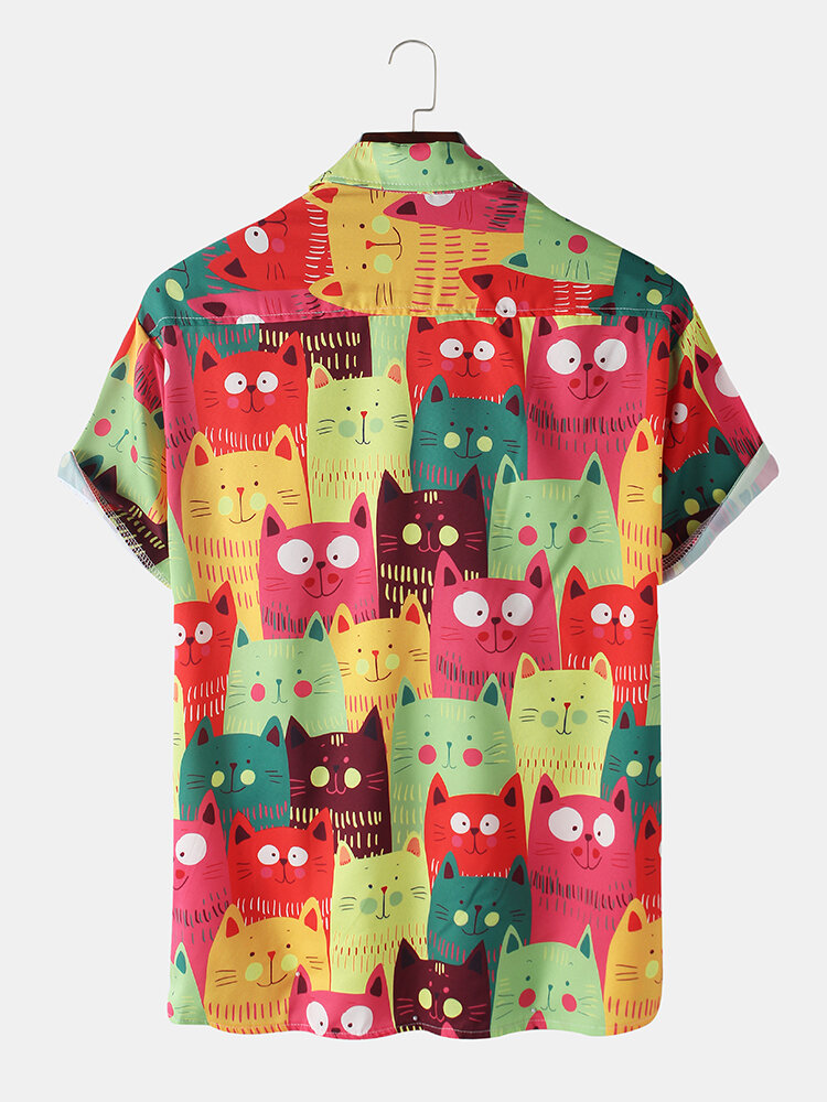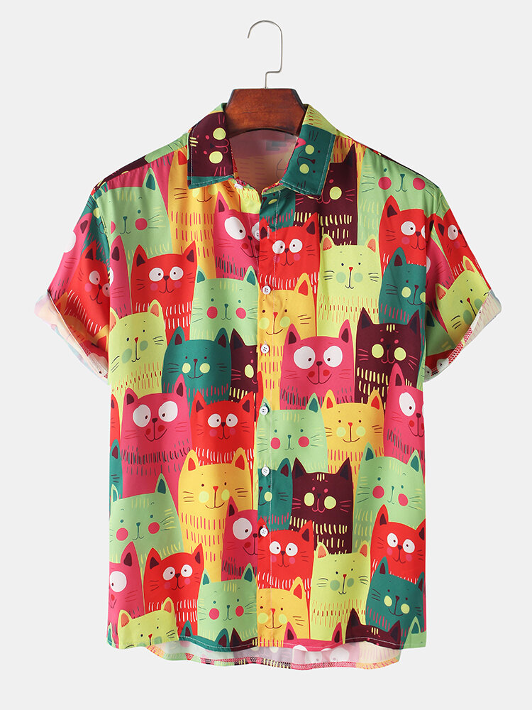 Mens Cartoon Cat Print Turn Down Collar Short Sleeve Shirts – Grey M