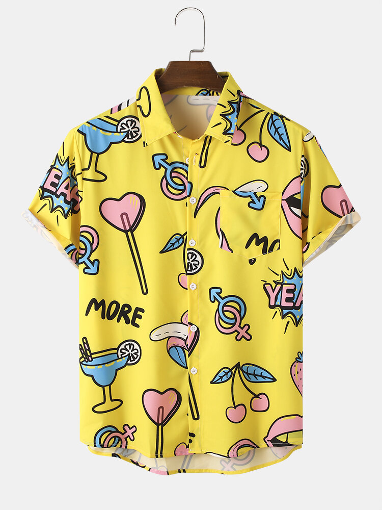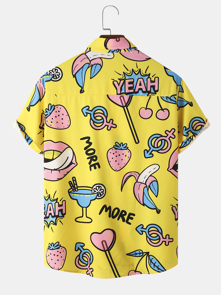Mens Cartoon Colorful Fruit Print Lapel Holiday Short Sleeve Shirts – Yellow M