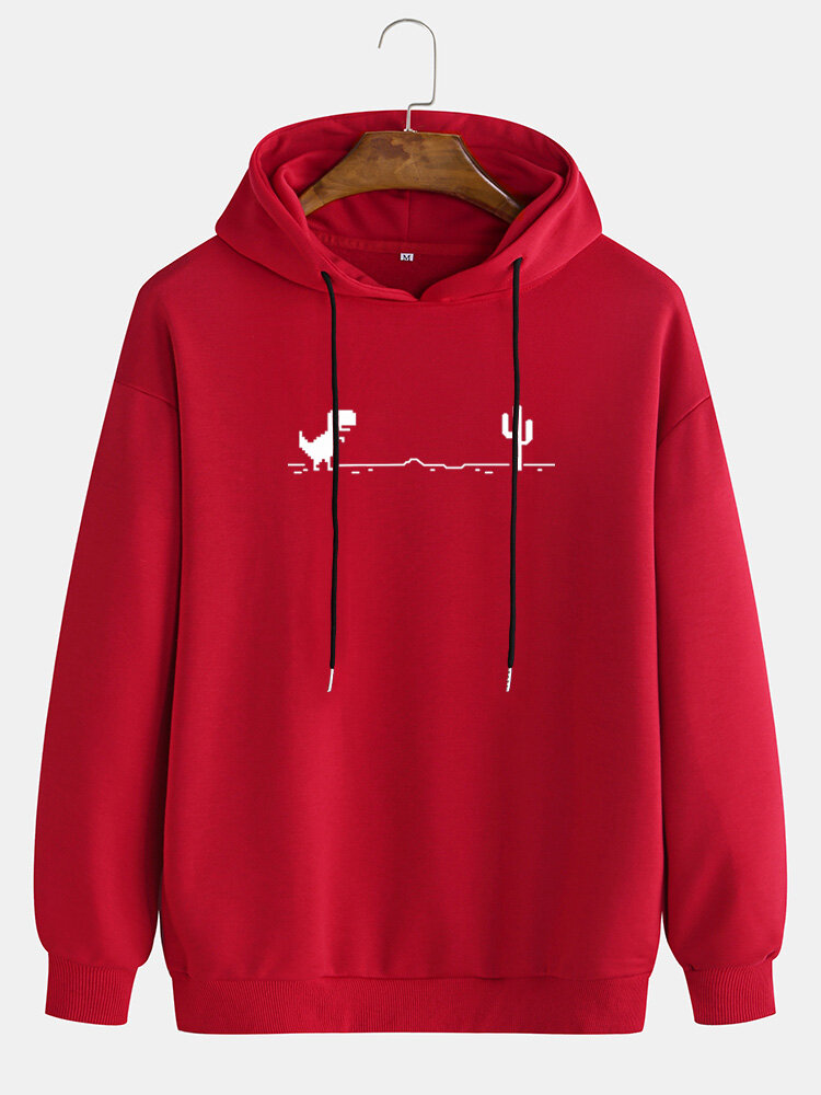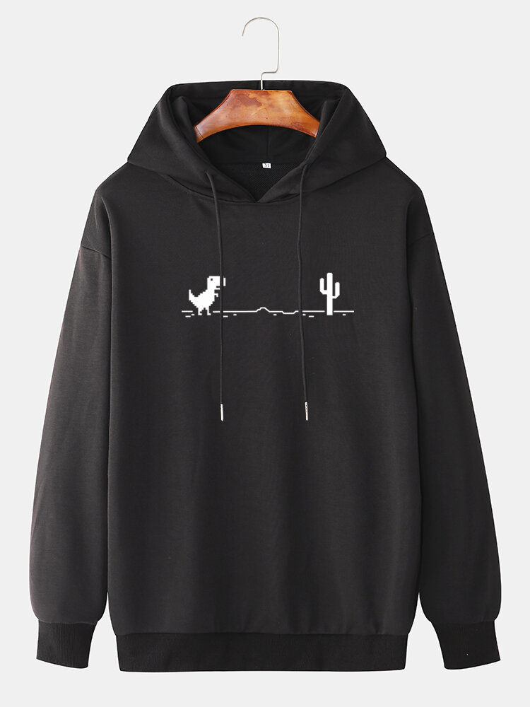 Mens Cartoon Dinosaur Cactus Print Casual Drawstring Hoodie – Black M