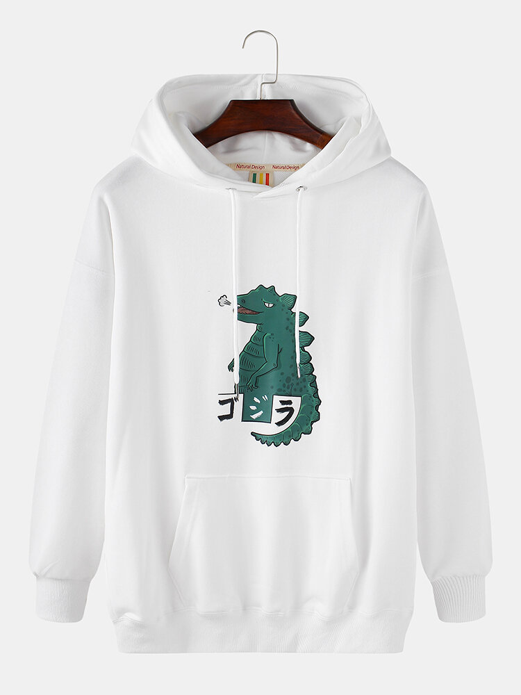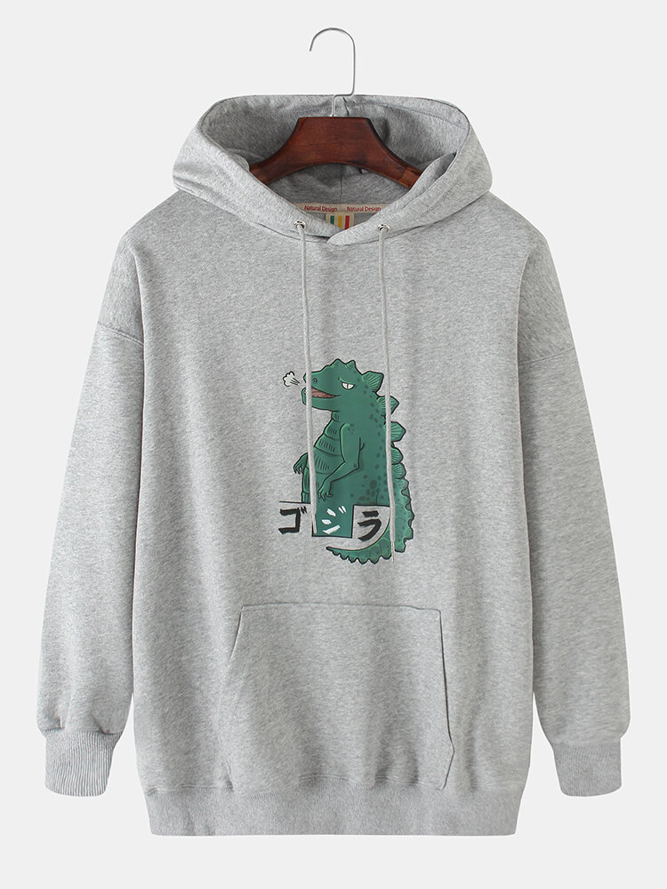 Mens Cartoon Dinosaur Print Drop Shoulder Hoodies With Kangaroo Pocket – Black 4XL